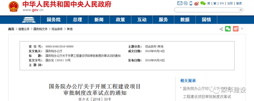 2018年5月18日,国务院办公厅正式公布《国务院办公厅关于开展工程建设项目审批制度改革试点的通知》(国办发〔2018〕33号),将大大精简审批环节!